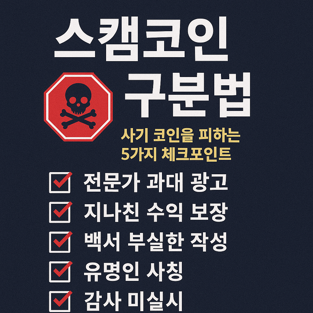 암호화폐 시장의 성장과 함께 다양한 코인들이 등장하고 있지만, 그중에는 투자자를 속이기 위한 '스캠코인'도 존재합니다. 이러한 스캠코인은 표면상으로는 그럴듯해 보일 수 있지만, 몇 가지 특징만 잘 살펴보면 미리 감지하고 피할 수 있습니다. 이번 글에서는 실제 투자 시 도움이 되는 스캠코인 구분법 5가지를 소개합니다. 초보 투자자는 물론, 경험자도 다시 한번 점검해 볼만한 체크포인트입니다.