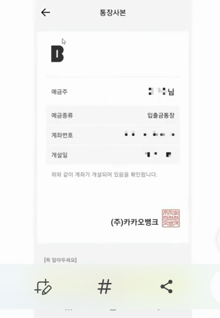 카카오뱅크는 실물 통장이 없기 때문에, 이미지 파일로 통장사본을 제공하는 방식입니다.