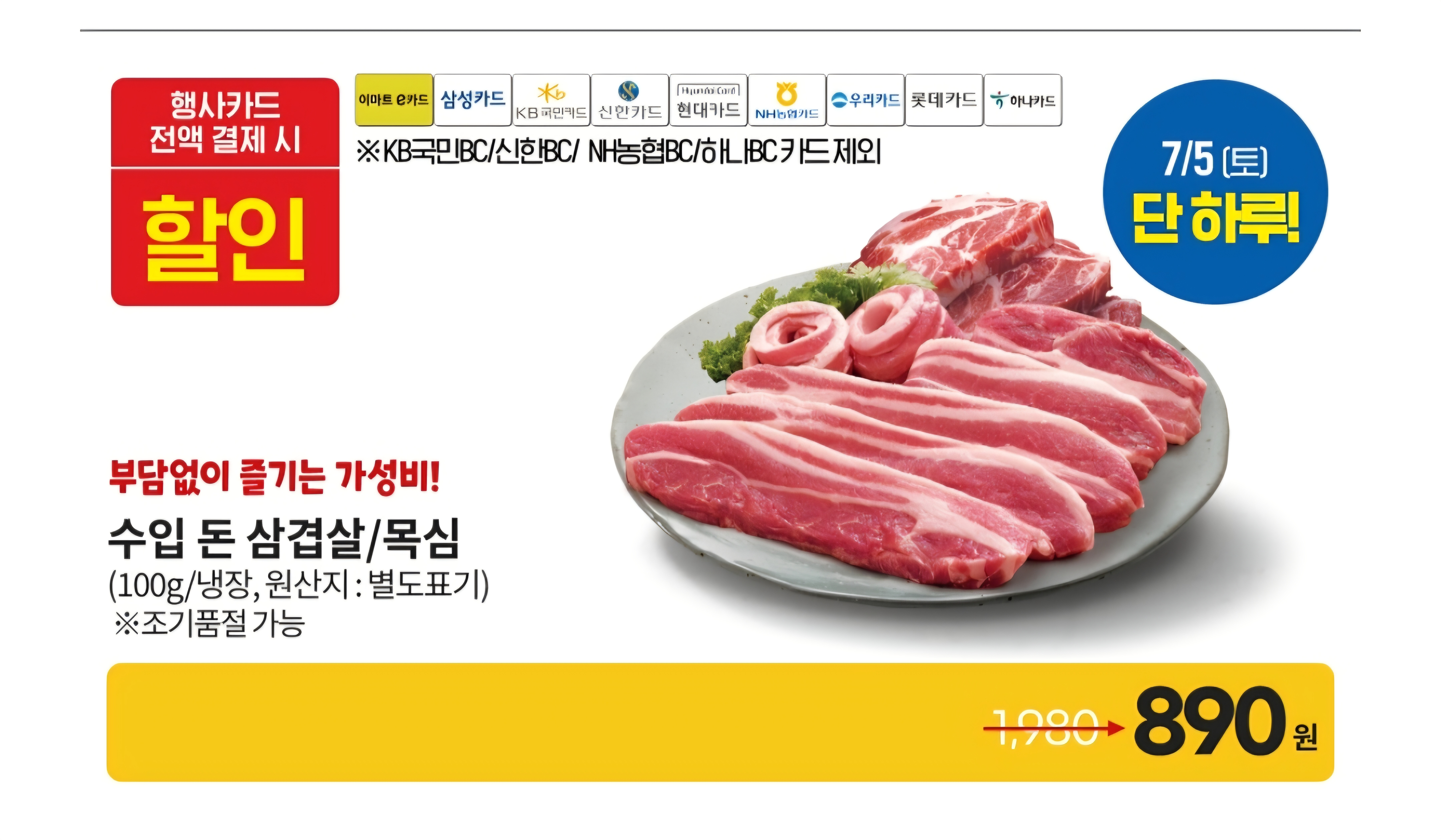 7월 5일 하루, 수입 삼겹살·목심을 100g당 890원에, 국내산은 1,190원에 판매합니다.