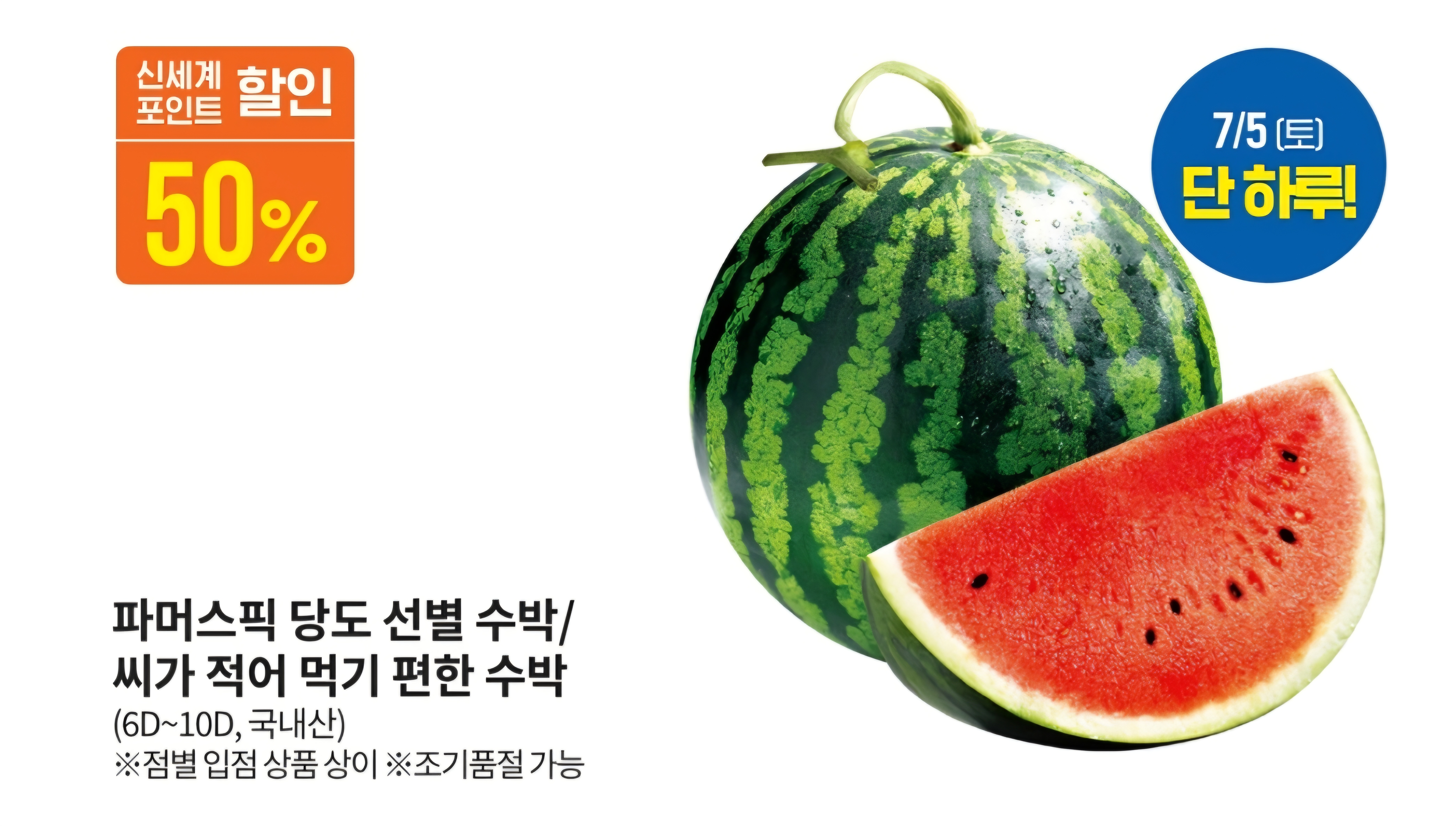 당도선별 수박 | 21,900원 | 10,950원 | 신세계포인트 적립 |
