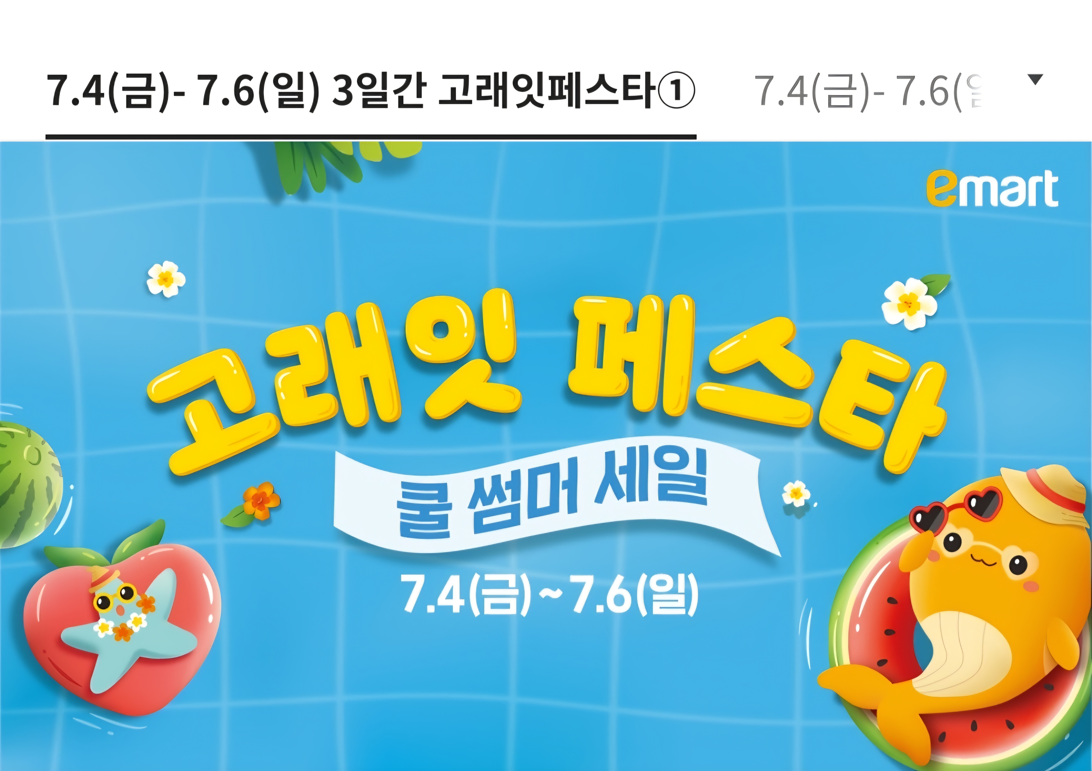7월 4일부터 6일까지 단 3일간 진행되는 ‘이마트 고래잇 페스타’는 치킨, 고기, 과일, 보양식, 생필품까지 다양한 품목을 최저가에 제공하는 대규모 할인 행사입니다.