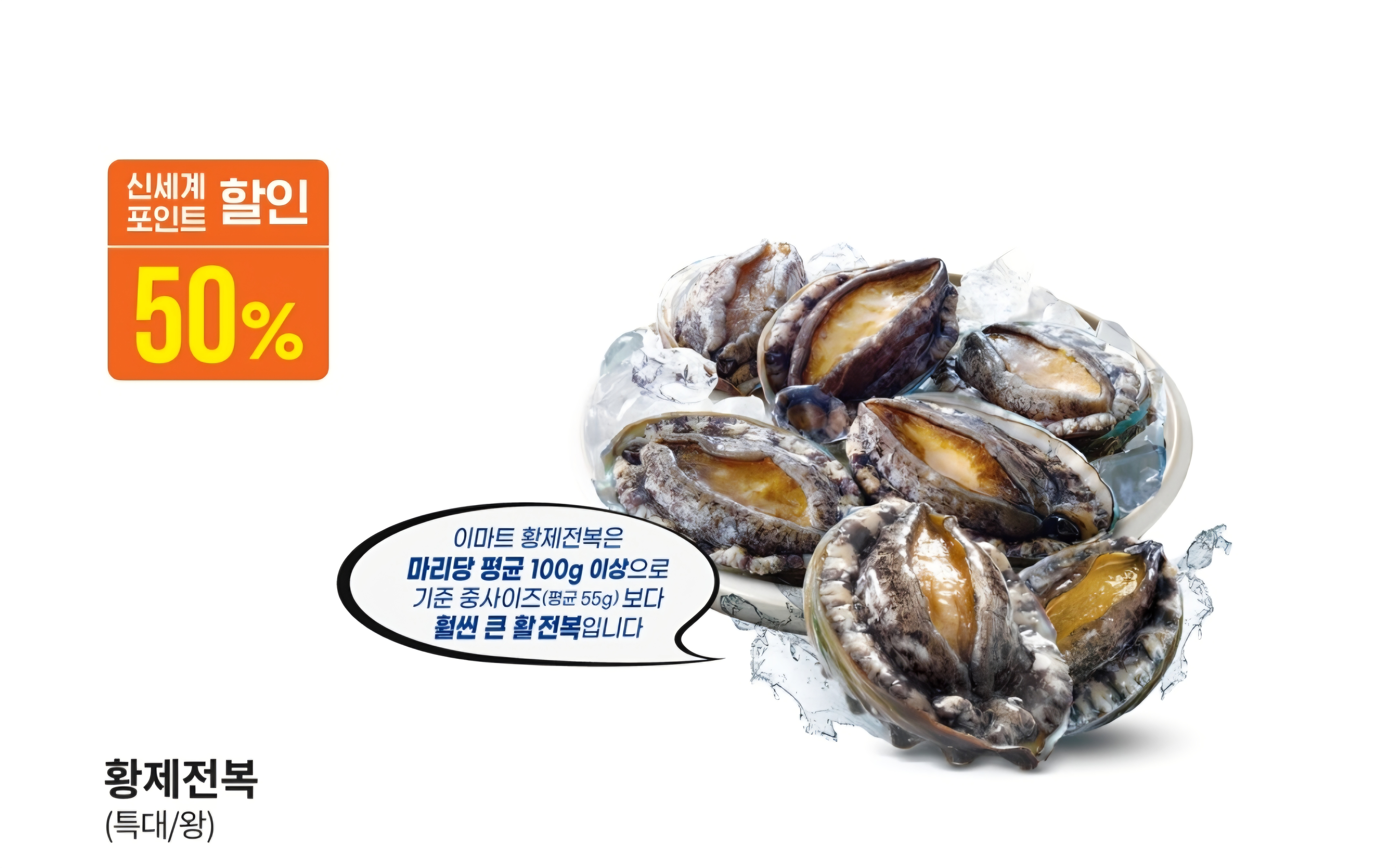 황제전복 | 8,880원 (100g 기준) | 4,440원 | 50% 할인 |